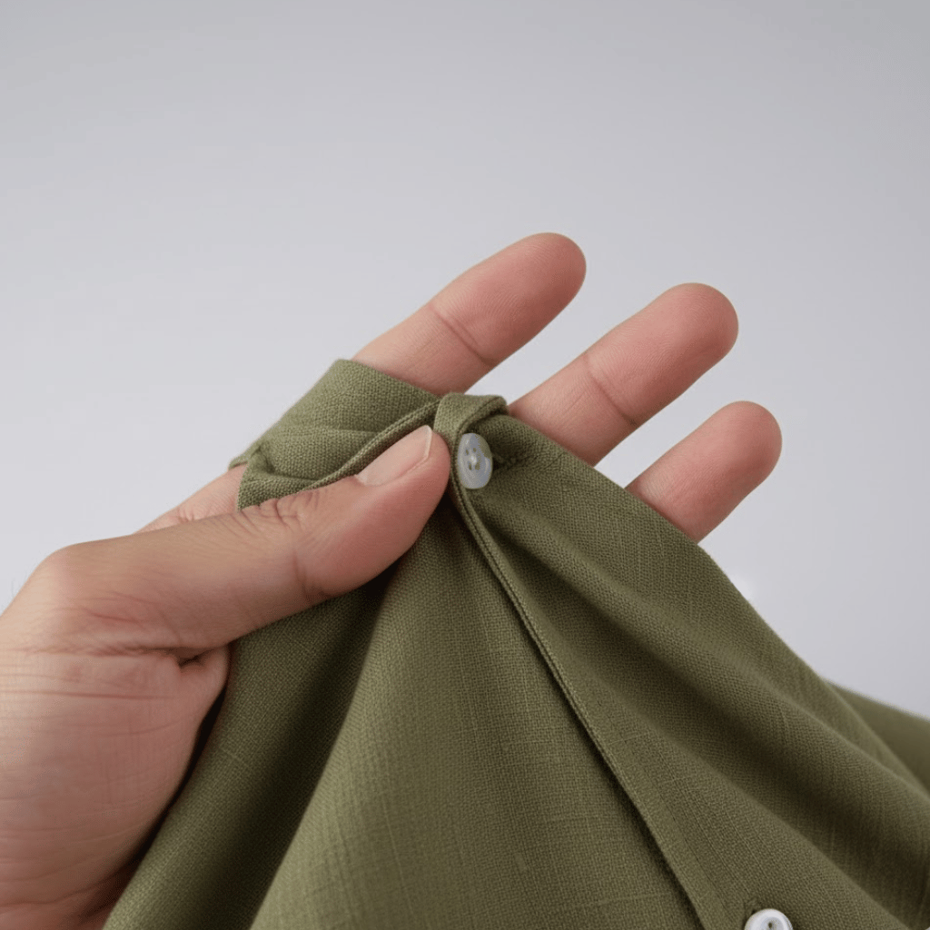 Botões Delicados: Os botões claros contrastam suavemente com o verde militar, evidenciando o cuidado nos detalhes.