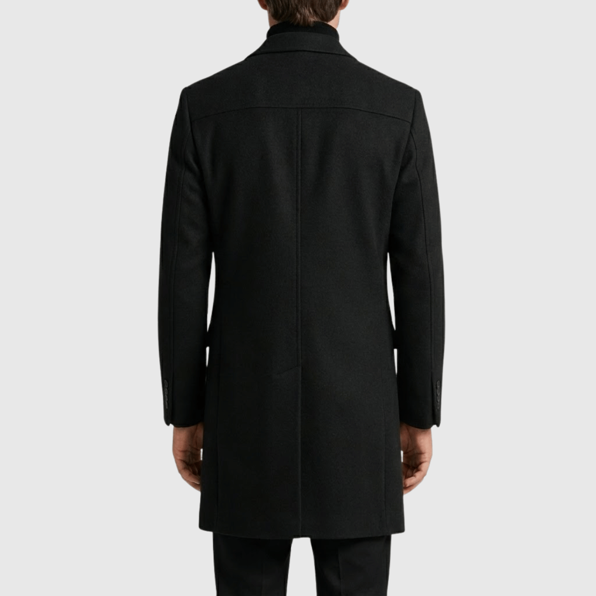 Este sobretudo masculino possui comprimento estendido que alonga a silhueta e amplia sua presença. O sobretudo longo cria linhas retas, postura firme e uma estética silenciosamente dominante.