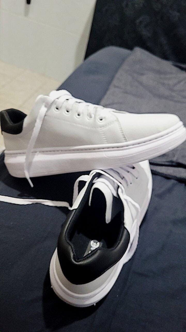 O segredo deste tênis branco masculino é o seu design minimalista: linhas limpas, um solado robusto e o detalhe sutil no calcanhar que o tira do básico. É o upgrade do tênis branco comum.